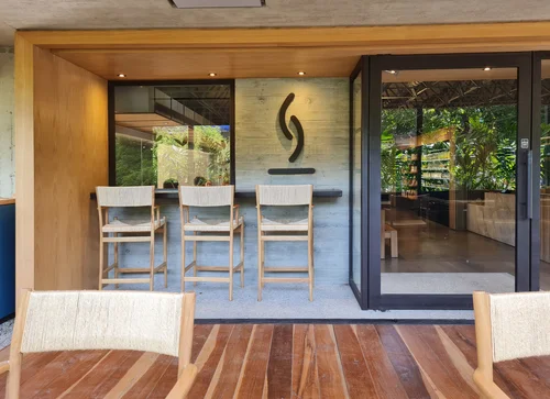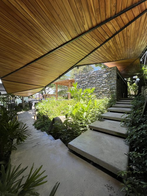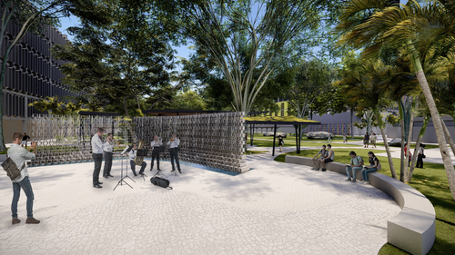 La aproximación al pabellón ofrece diferentes experiencias espaciales, dependiendo del punto de llegada: Desde la casa del estudiante hacia la plaza Mickey - que permanece intacta como pieza histórica de la universidad - te recibe un muro calado visualmente permeable, posado sobre una pantalla de agua, que en días lluviosos recolecta agua y se convierte en fuente. Saliendo del edificio de ‘módulos’, un techo verde cubierto con enredaderas conecta con el eje norte/sur, llegando hasta el centro Loyola.